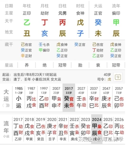 33-43岁癸未运,伤官可以制官,天干戊癸相合,地支未土可制水则工作能稳定或能得到一份不错的工作,由于与年支丑未相冲,故而容易不利长辈,伤官见官要注意口舌是非,走伤官大运,野心都是很大的,欲望大,想法多,但都不太容易实现。所以在这十年依然不适合去创业,做什么投资。应该保守一点,上班是最好的选择。平时要加强学习,丰富自己的知识,或学习一门技术,这样自然会增加财运,获得好的机遇。赚钱都是一步一步来的,而不能企图一下子就富裕了。如果自己没有好的资源人脉,那么只有靠能力去获得资源人脉了。