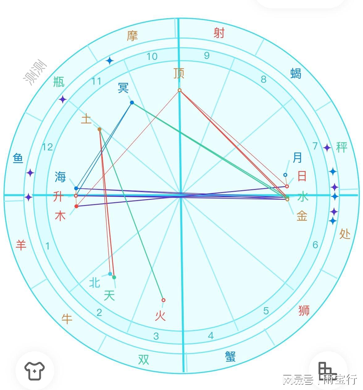 在星盘中,还有九大行星,月亮、水星、金星、火星、木星、土星、天王星、海王星和冥王星。