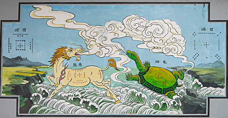 伏羲当年发现一匹龙马从黄河中现出,背上背着一张图,此图名曰河图,而洛是指当年大禹治水时,从河南的一条河流洛水中爬出来一只神秘的乌龟,龟壳上的图案十分特殊,伏羲便将此图命名为洛书。所以《周易》中说到:“河出图,洛出书,圣人则之。”也就是说,圣人们用河图洛书创建了中华的传统文化的根基。