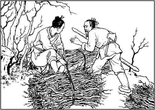 这一年年关将近,明儿个就是灶王爷上天的日子。王柱想,这几天柴卖得快,我得加劲多砍,多卖点儿,好抓挠几个置办年货的钱。这天,他起了个五更,爬到山上天刚放亮,砍完柴挑进县城,才卖十文大钱。他把钱揣在怀里,想到粮米铺买几斤米面。刚抬腿要走,忽见对面走来一个面黄肌瘦的干巴老头儿。他手里拿张画儿,有气无力地叫卖着:“卖年画喽,卖年画喽!过大年了,买一张吧!”他边喊着来到王柱面前,像哀求似地说:“小兄弟,买一张吧!”“老人家,我的腰里没钱哪!”你不是刚卖完柴吗?”王柱右手往前胸一捂,说:“我还等用这钱买米下锅呢!”说完转身要走。卖画老头儿伸手把他拽住,哭唧唧哀求:“小伙子,我已经有三天没闻着饭味儿了,行行好,把这画买去,成全成全我这苦老头子吧!”王柱见他可怜,便一狠心,从怀里掏出五文钱递给他。老头儿笑呵呵地把钱揣在怀里,顺手将画递给王柱。王柱一摆手说:“我家房小屋子破,有画也没处贴,你这画还是留着卖给旁人吧。”没曾想,那老头儿沉下脸来,气哼哼说:“你买了我的画,我收了你的钱,你就该把画拿去。要我留着卖给旁人,我还真就没那工夫,拿着!”说着把画硬塞进王柱怀里。王柱见他那急头白脸的样子,心想:这个怪老头,把人家一片好心当成驴肝肺了,拿就拿着吧。拿到家就贴在炕脚底下的墙上了。