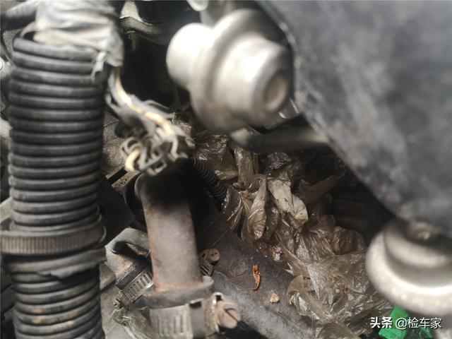 如果外观还算过得去,发动机舱内部就真的是惨不忍睹了,机舱底部有老鼠常住了,塑料袋、碎骨头、卫生纸都收集在一起,还有一阵老鼠排泄物的味道,令人上头。老鼠对车辆的线束危害巨大,它们最喜欢用车身线束来磨牙,导致线束破损,非常容易引起车辆自燃。