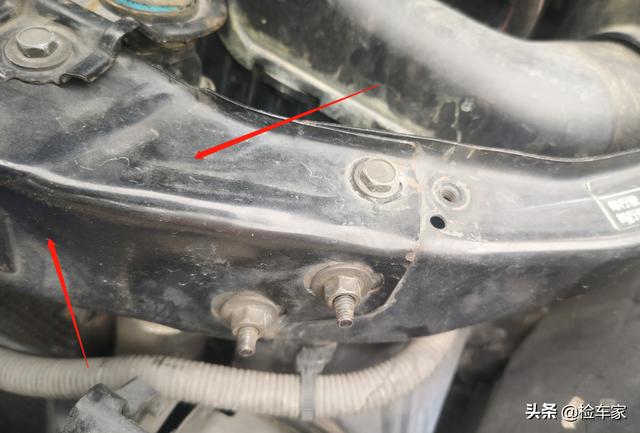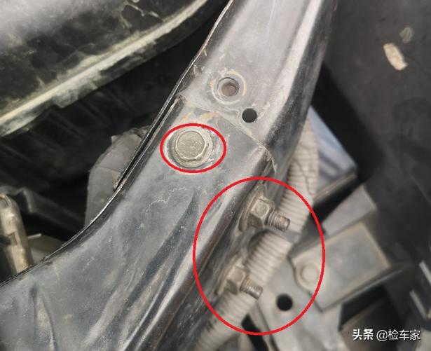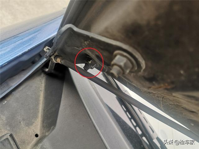 接着是机舱内的检测,打开机盖,发现前盖存在明显拆装的痕迹,拆装前机盖一般是由前方碰撞事故所导致的,错位后就需要拆下来重新装配调整。