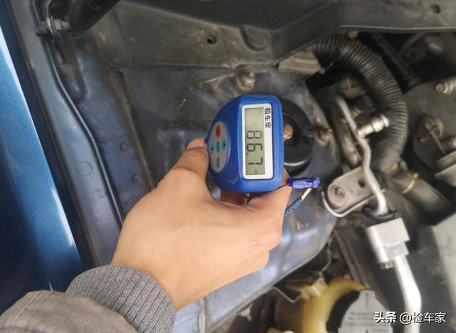 话不多说开始检测,左前叶子板存在钣金现象,而且位置比较高,初步估计前部有过事故。