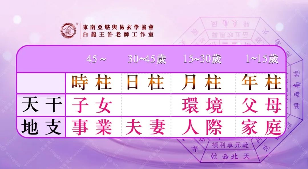 年柱:影响年龄1至15岁。可以查探祖辈的兴衰,观察幼年的祸福,推测父母和祖父母的庇护,象征个体幼年时期的福祸及父母的兴衰。