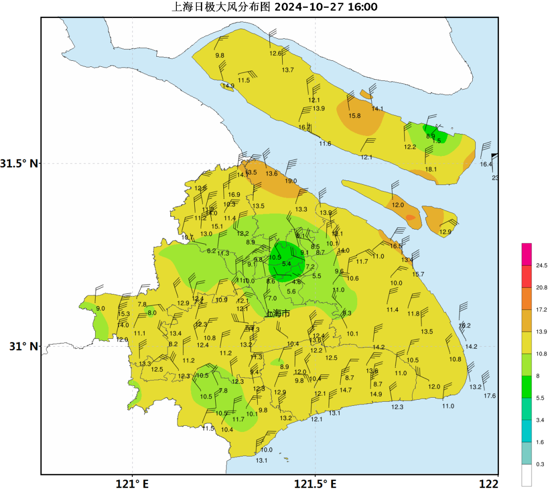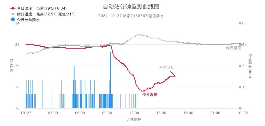 上海今天上午雨势比较明显,中午起雨势有所减弱。昨天20时到今天16时的雨量统计显示,全市多在中雨量级,局部地区有大雨。其中,杨浦五角场镇最大,为34.0毫米。随着冷空气南下,今天下午偏北风增大,沿江沿海地区出现7~8级阵风,崇明东滩最大,达9级。今天午后体感明显变凉,徐家汇站白天最高气温是出现在上午8时58分,为21.9℃。夜间气温继续下跌,晚归记得多穿一点。