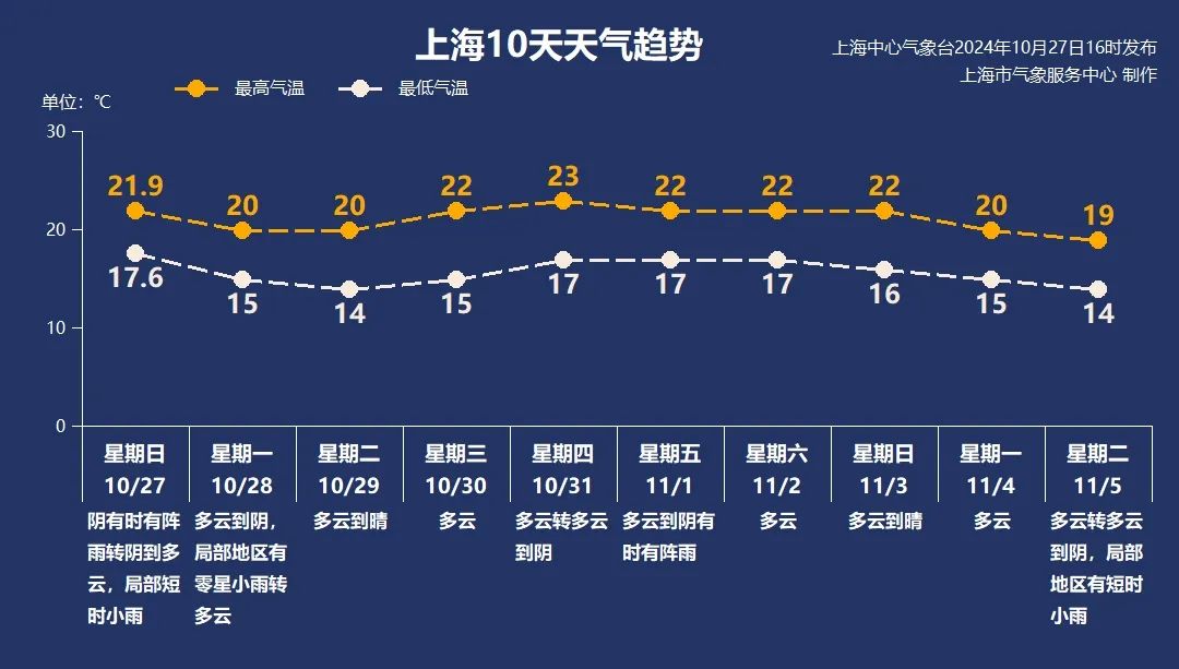 上海今天(10月27日)又是被阴雨笼罩的一天,明天(周一)将以多云到阴天气为主,局部地区仍有些小雨,气温进一步下降,在15~20℃之间。周二到周四,上海主要受高气压控制,将迎来晴好天气。