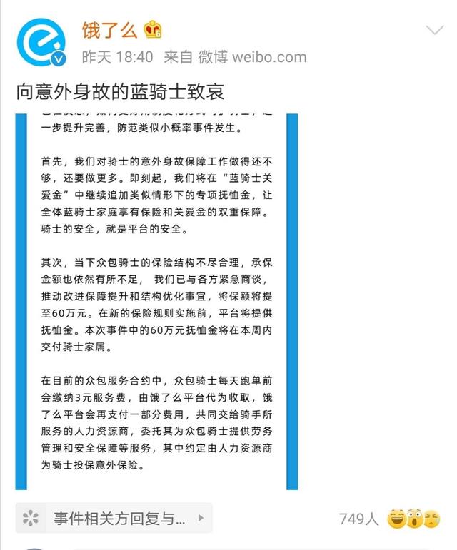 其次,当下众包骑士的保险结构不尽合理,承保金额也依然有所不足,饿了么已与各方紧急商谈,推动改进保障提升和结构优化事宜,将保额将提至60万元。在新的保险规则实施前,平台将提供抚恤金。本次事件中的60万元抚恤金将在本周内交付骑士家属。