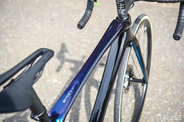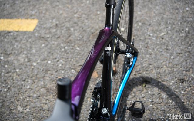 上管则使用了目前十分流行的变色龙涂装,在不同角度能呈现蓝、紫、绿、金四种颜色,让小编想起了之前评测过的那辆涂装十分漂亮的Emonda ALR。
