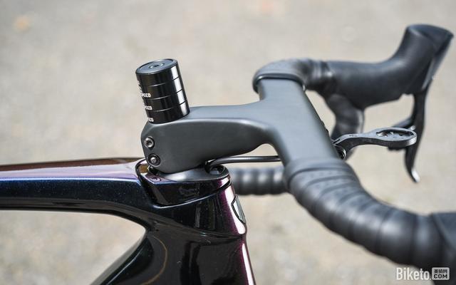 整合式碗组盖造型也与Madone一致,入线方式也与之前评测过的Madone SL6一样,并未使用全内走线。这样最大的好处就是把组选择的灵活度很高,除了Fitting比较方便外,你还可以给它换成那些奢侈品超轻把组来进一步减重。